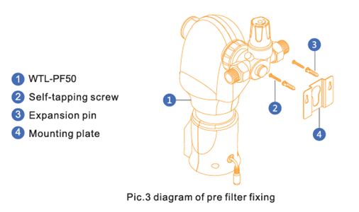 Slowly open the main water inlet valve, allowing the source water to flow through the pre-filter to all the equipment. Open the outlet valve of household equipment, let water flow out, and then close all the outlets. Monitor the pressure gauge and all joint connections for any potential leaks. It is recommended to run water for 10 minutes to check for leaks after installation (as depicted in Pic.4).
