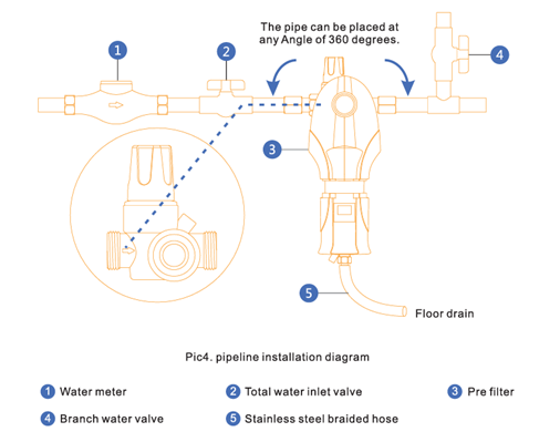Note: the direction of water flow is consistent with the direction of the arrow on the product. The pipe can be placed at any Angle of 360 degrees.